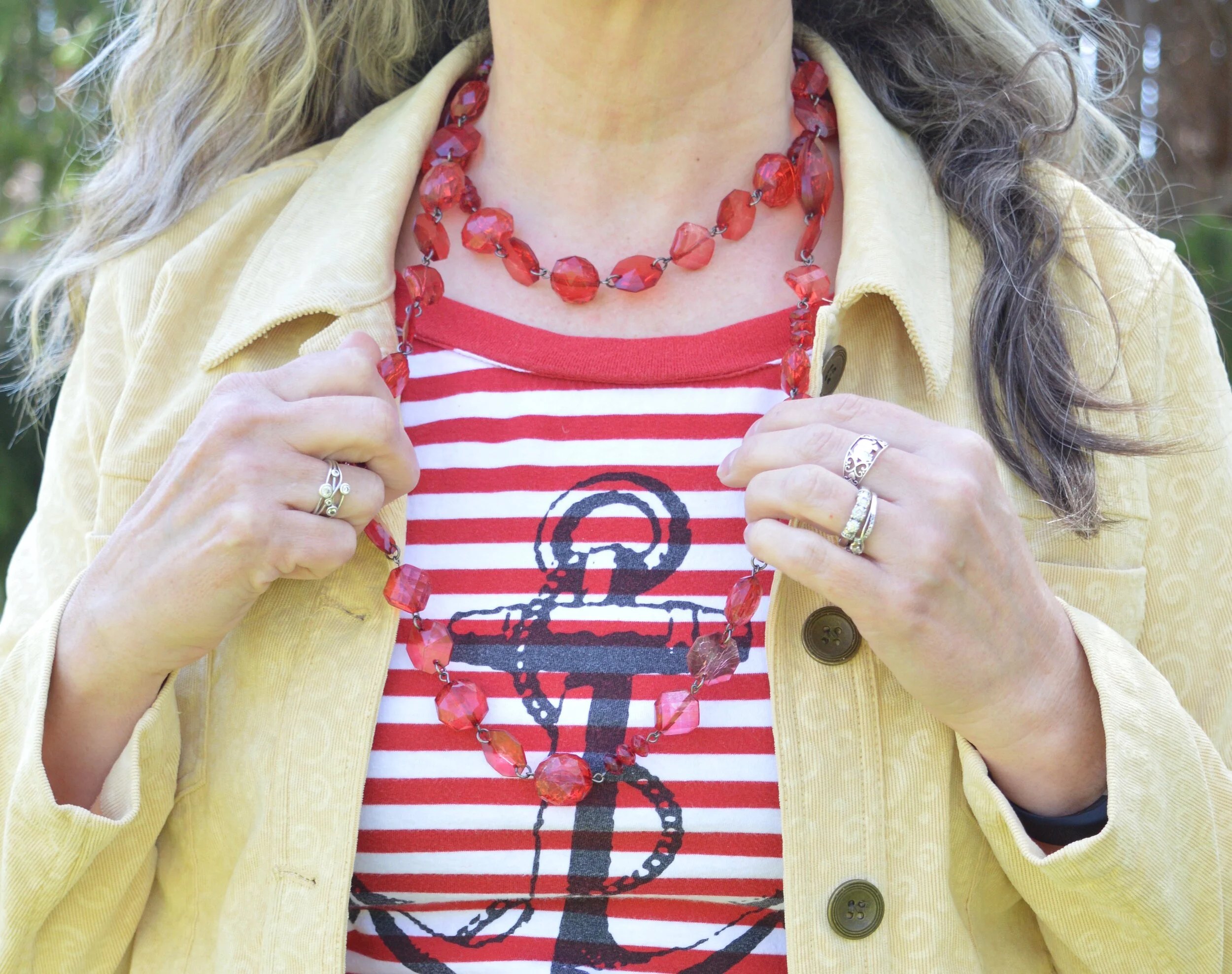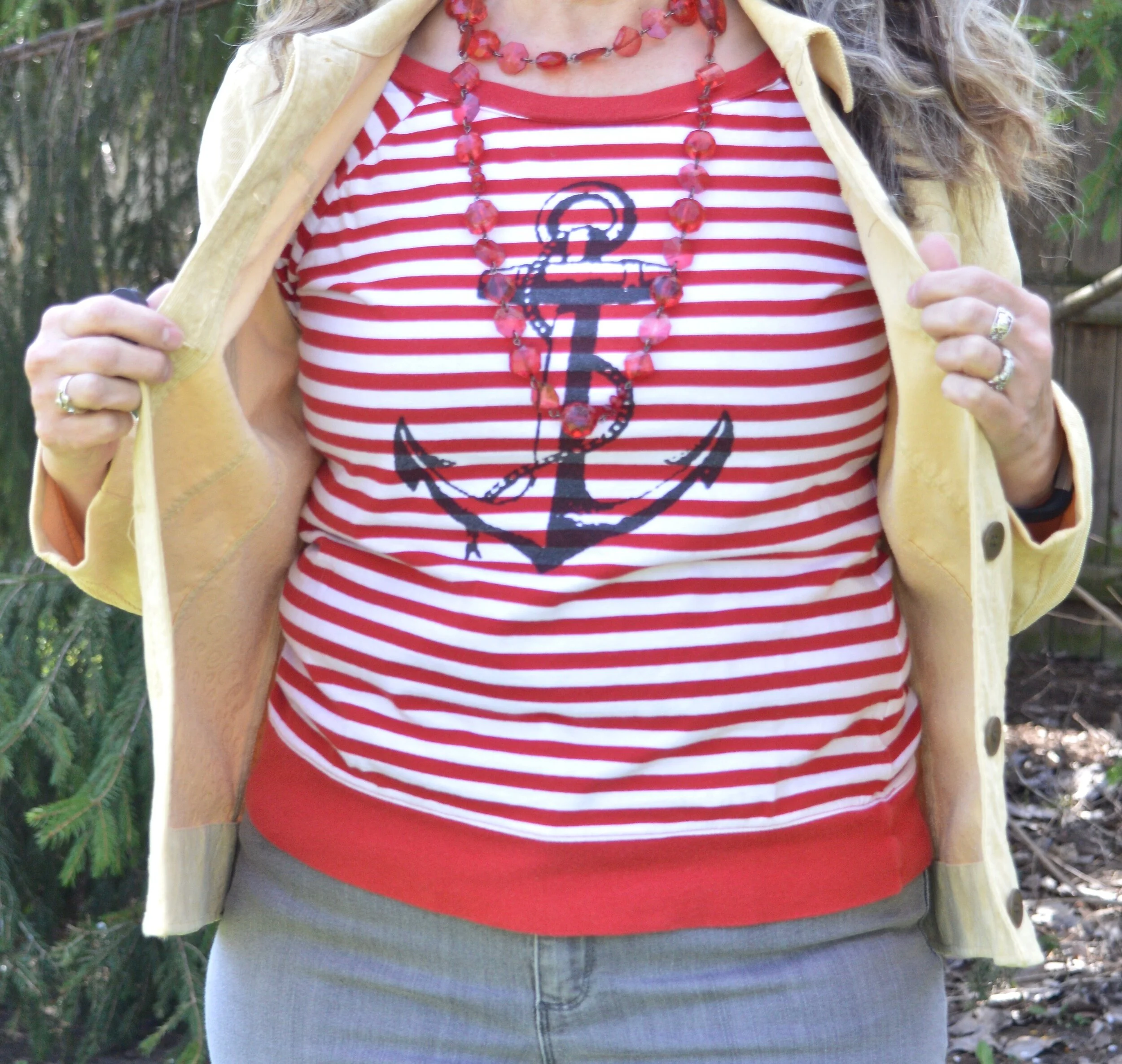 Another thrift find, this Nautica 3/4 sleeve tee is a great spring and summer staple. Not only does it have the bright Flame Scarlet and white stripes, but it bears the nautical sign of the anchor. It makes me think of the anchor of the Lord, that moors my boat in this ever stormy sea called life.