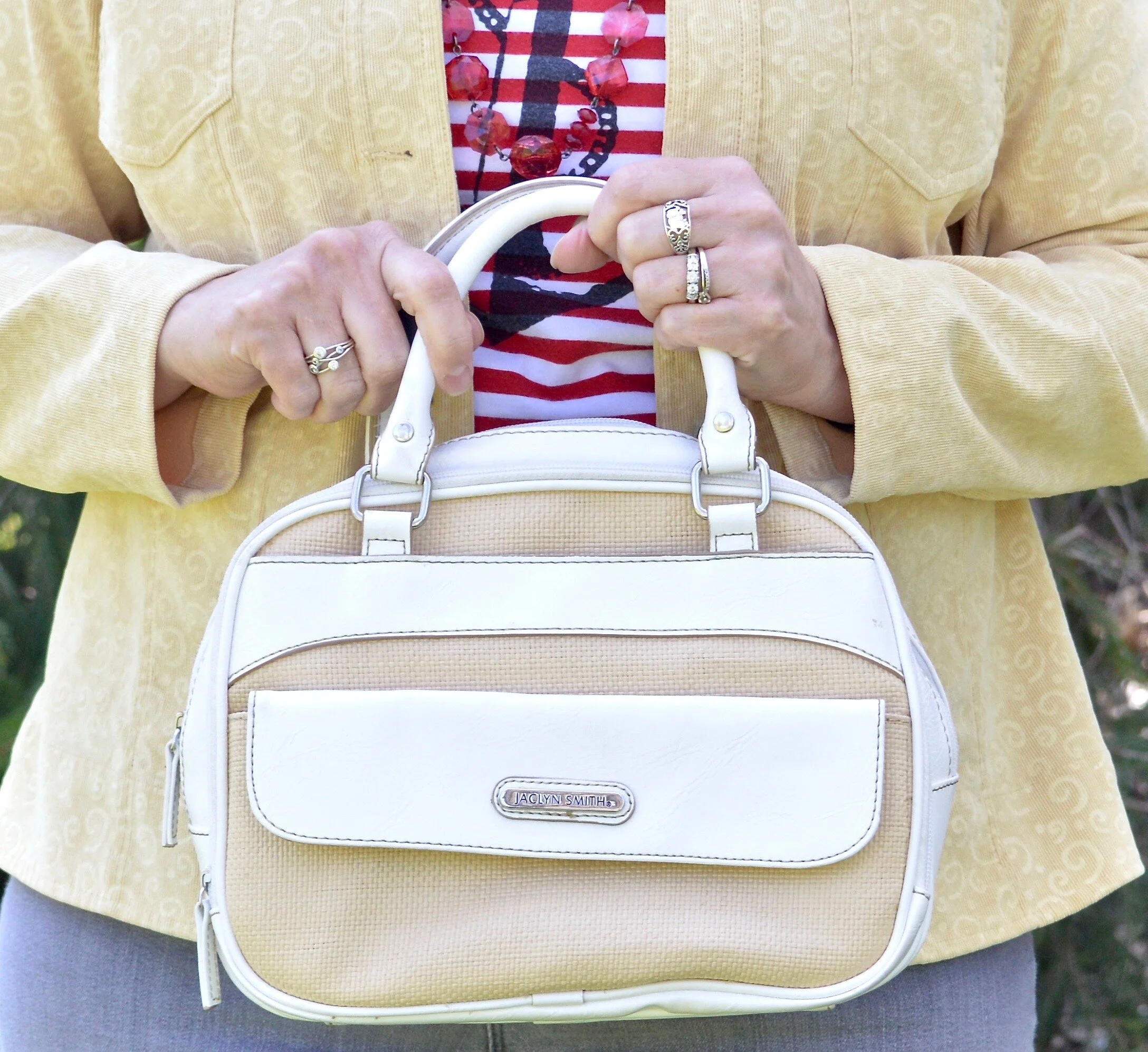 I chose this simple thrifted Jaclyn Smith top handle bag to keep the look light and fresh. This also comes with a longer strap so it can be converted into a crossbody bag. You can see how I styled this bag with white jeans, Bermuda shorts and high waisted jeans.