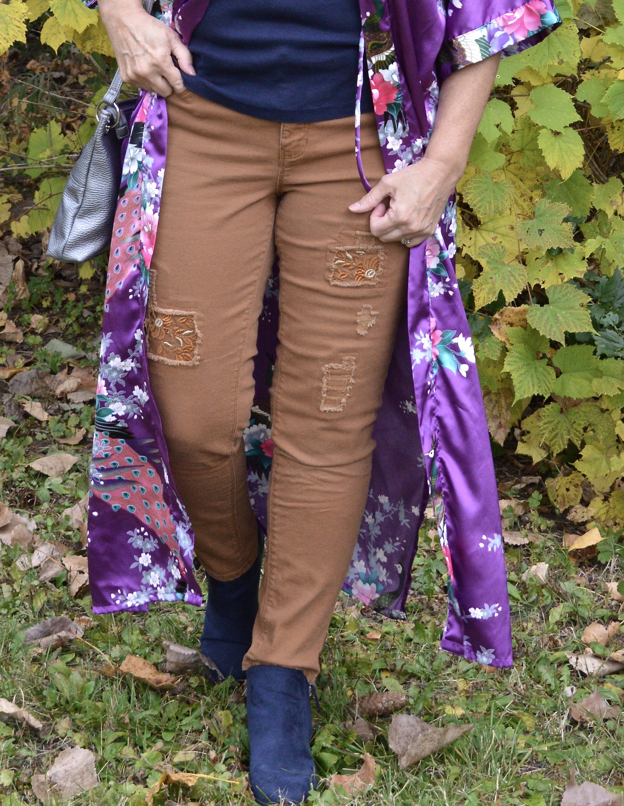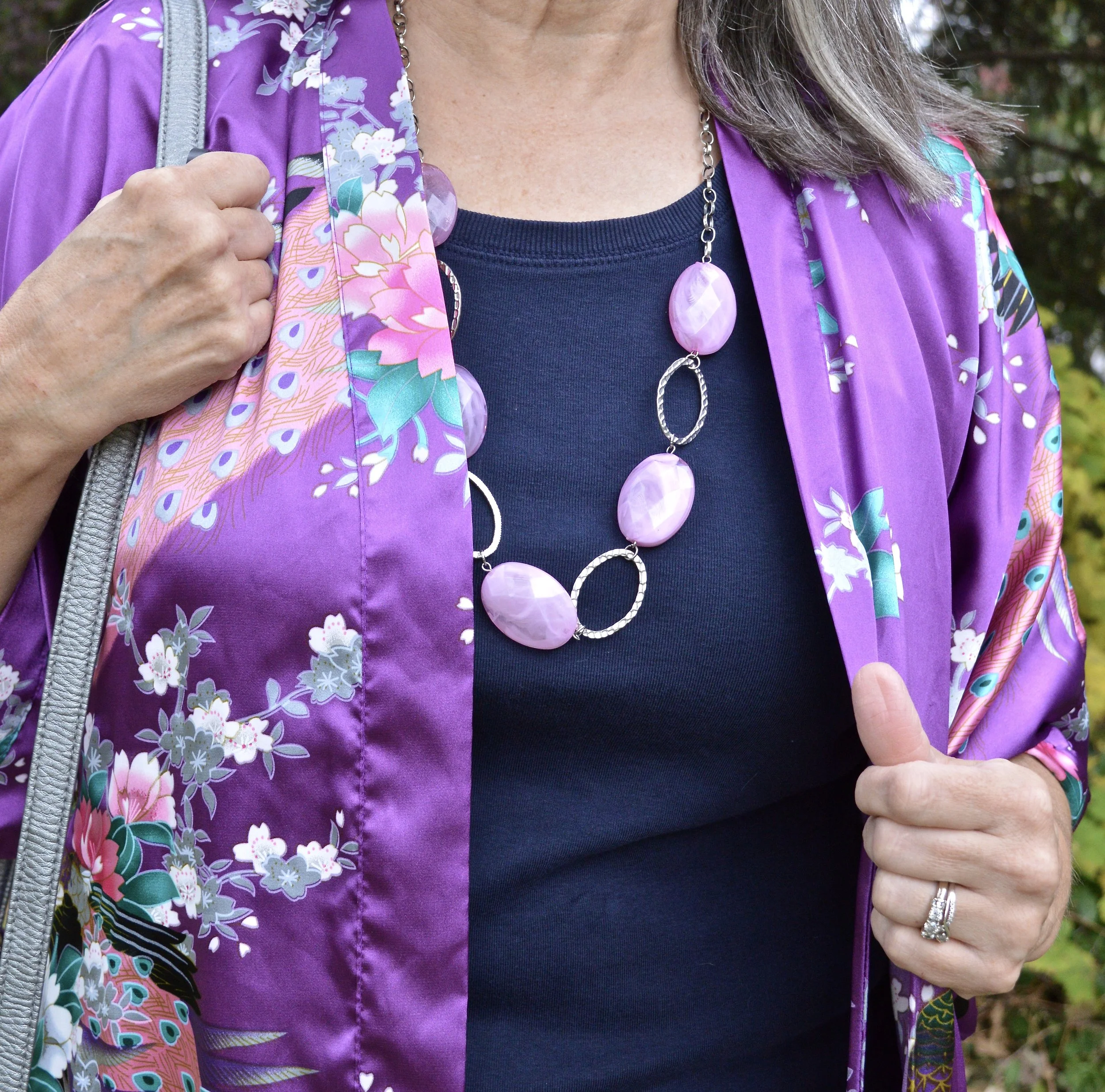 As I continue the Pantone Autumn/Winter color series, I want to remind you my graphics are interpretations of the colors and do not match exactly. I have provided links to the Pantone website and the colors, so you can see what they actually look like. This week’s colors are a combination of a bright pinky purple, an earthy caramel brown and a deep navy. My Rose Violet is definitely too purple. If you click on the link you can see it really is more of a Fuchsia pink than purple. I don’t know why I thought my kimono was the right color. Oh well, I still think it makes for a bright, interesting outfit, even if the colors aren’t exact.