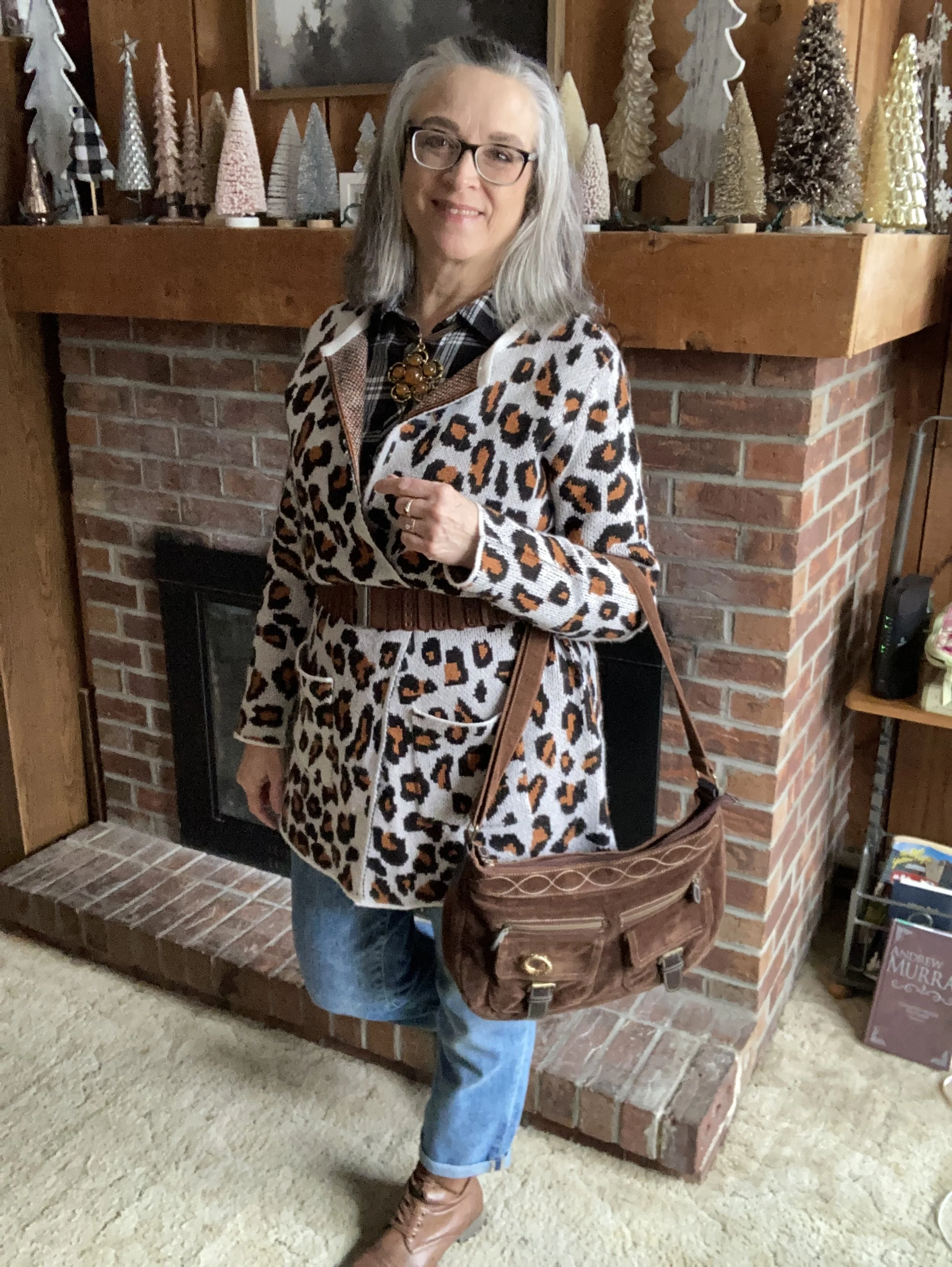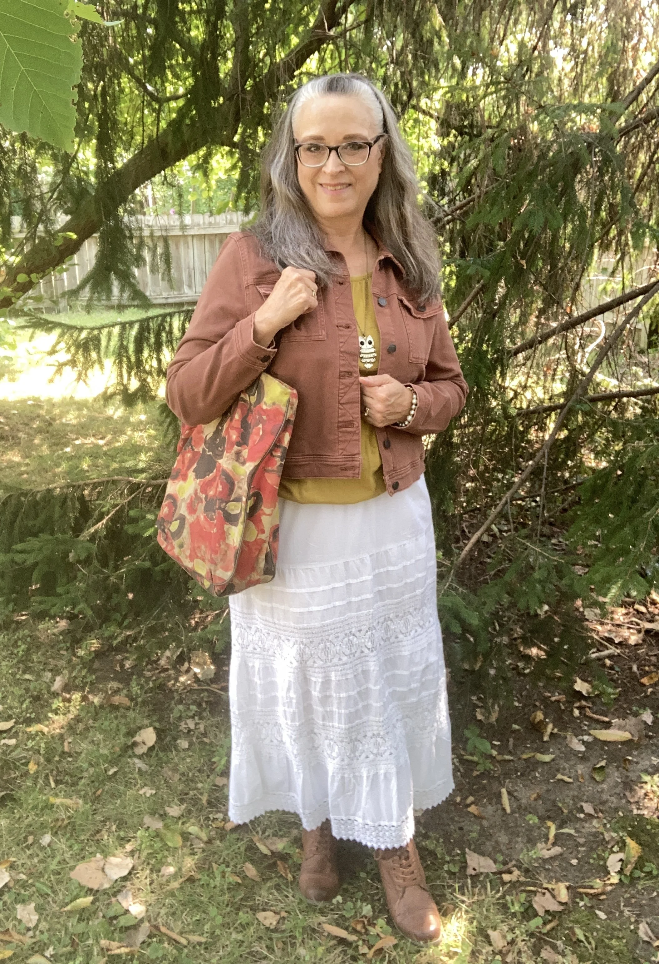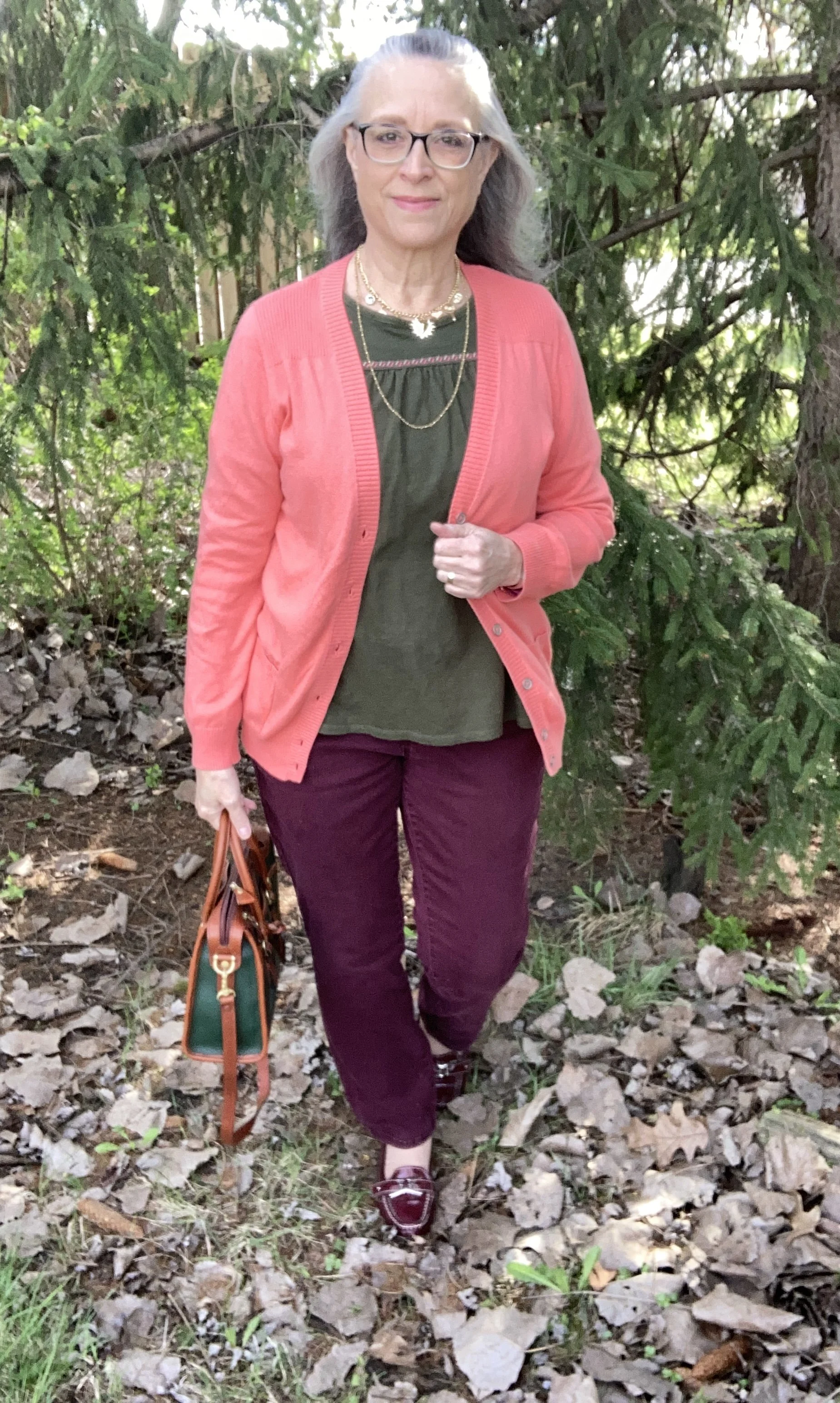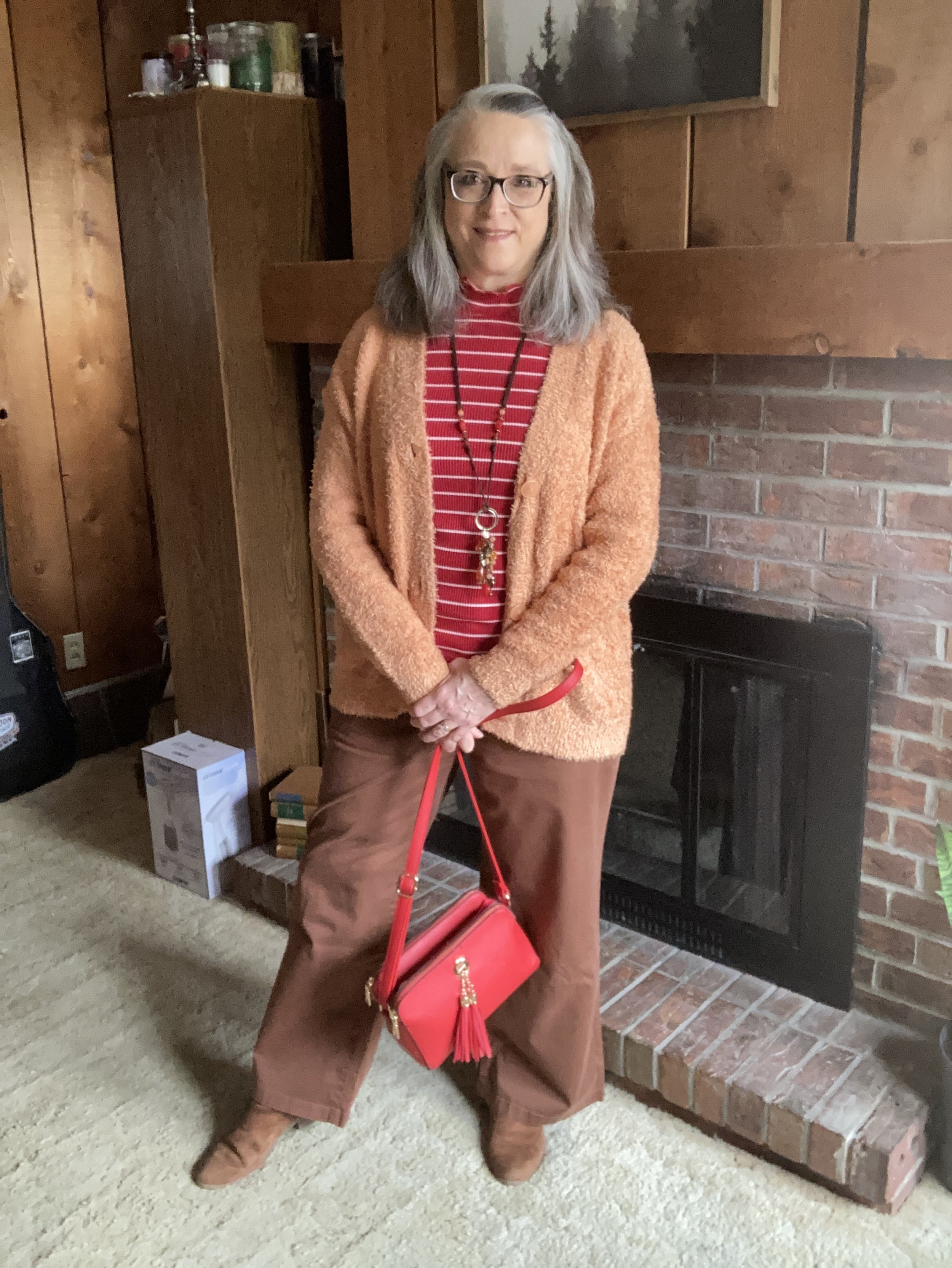 For today’s outfit I looked again at my list of what was trending for Fall 2025. It is hard to even think about fall, as for many of us the leaves are already off the trees, we have had a ground covering snowfall, and we are barreling towards Christmas. However, it is still fall and I won’t pull out my Christmas tees and sweaters until the day after Thanksgiving. Ha, ha.