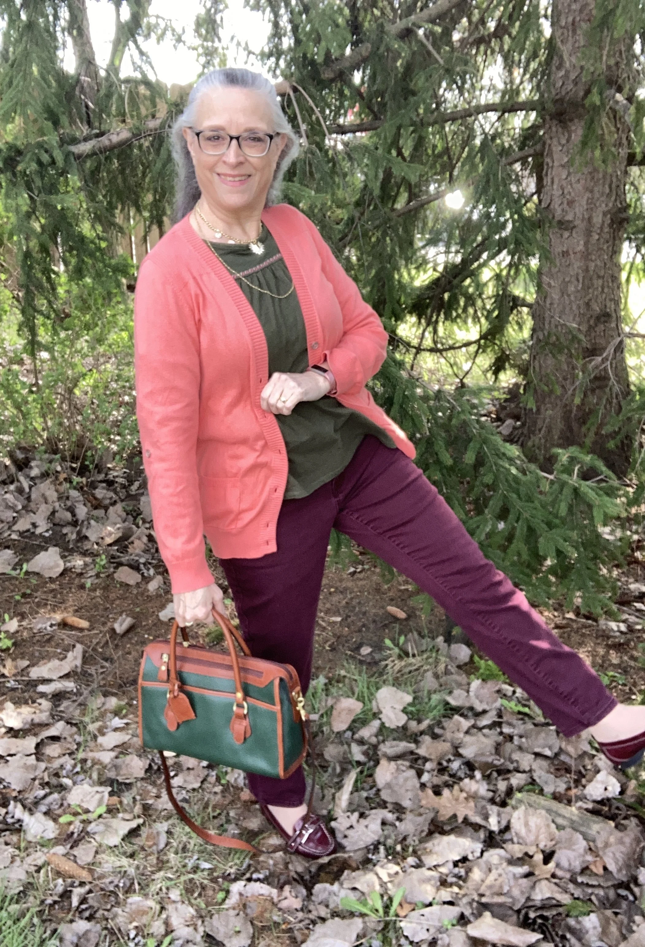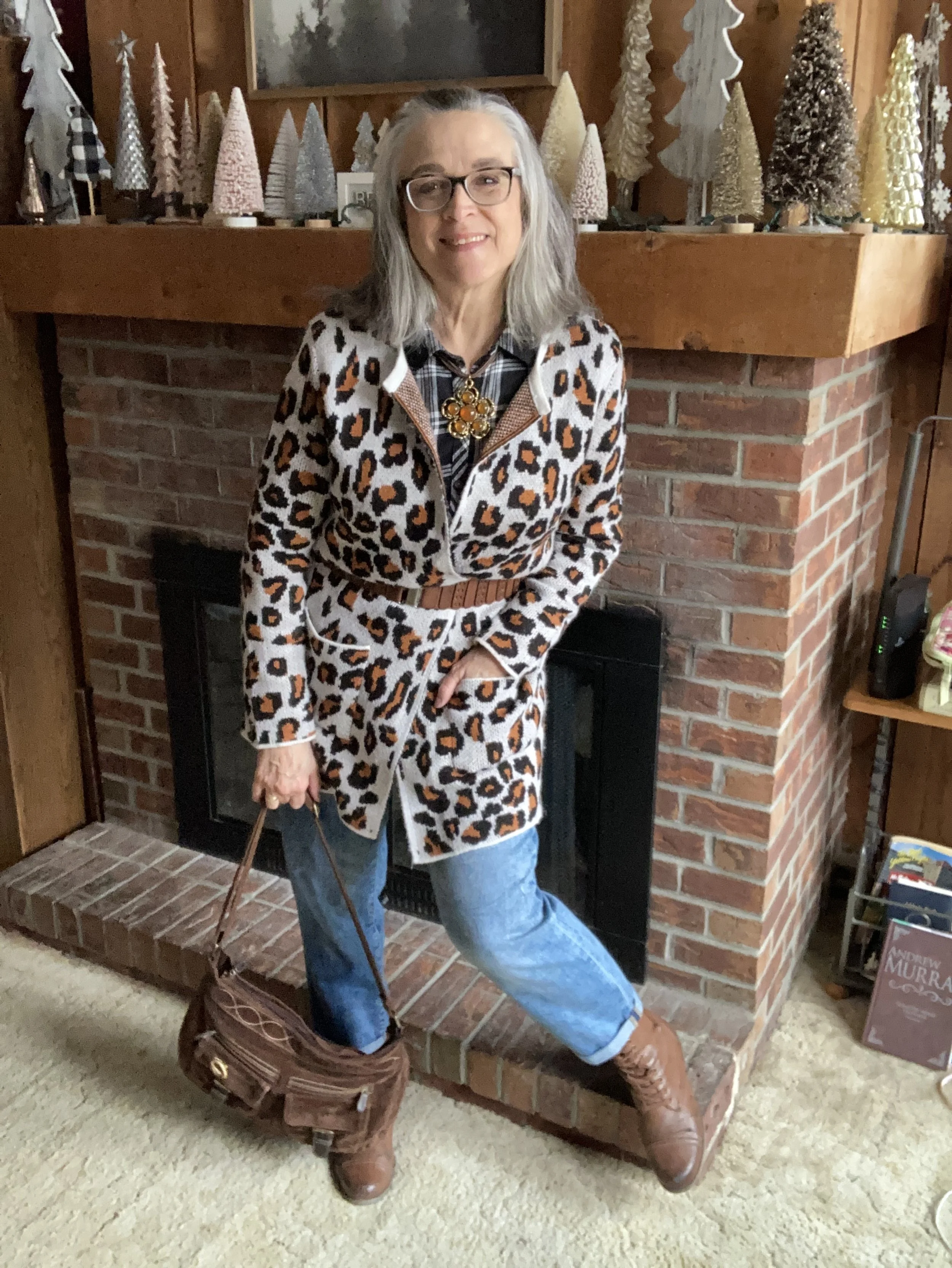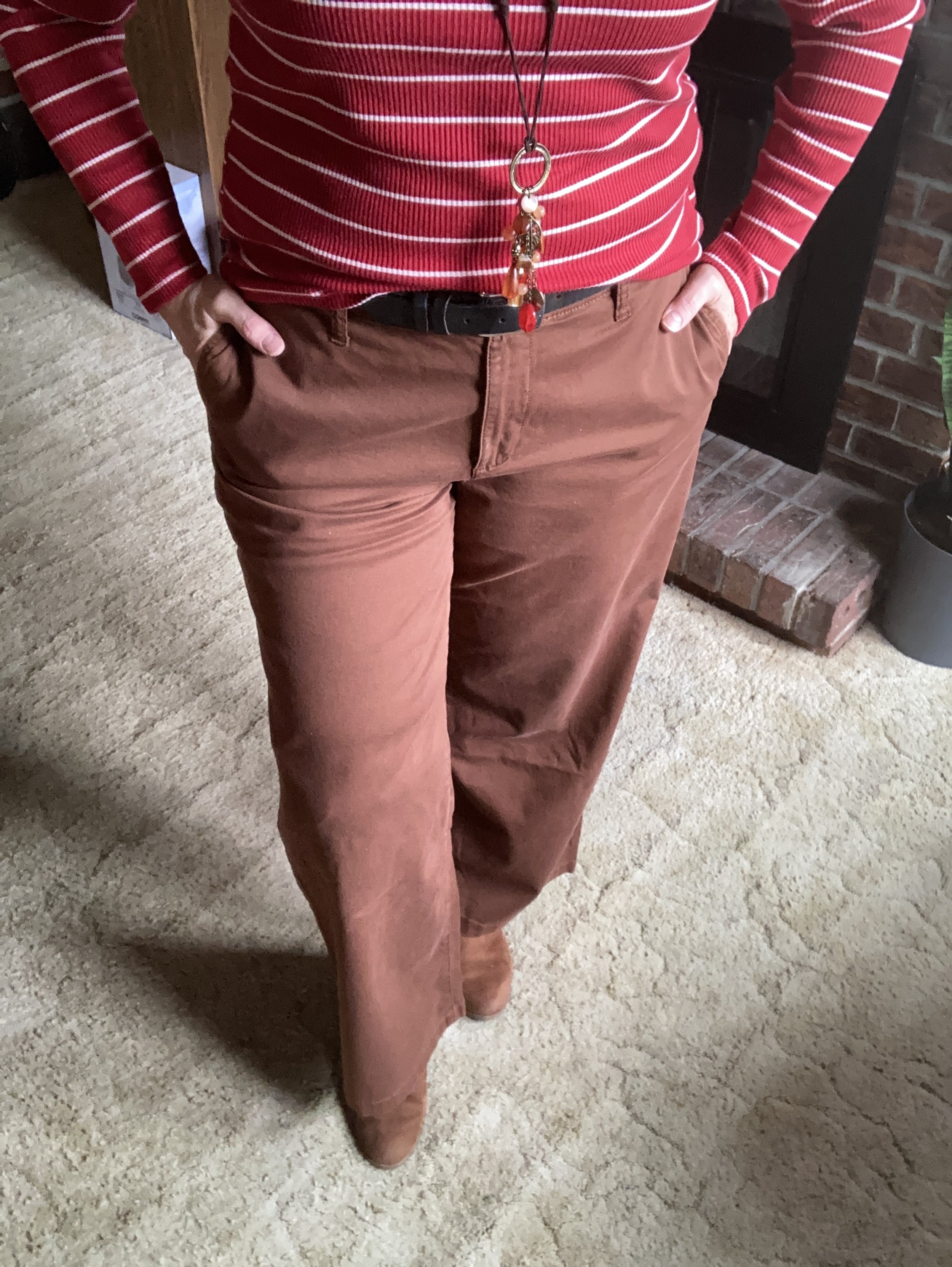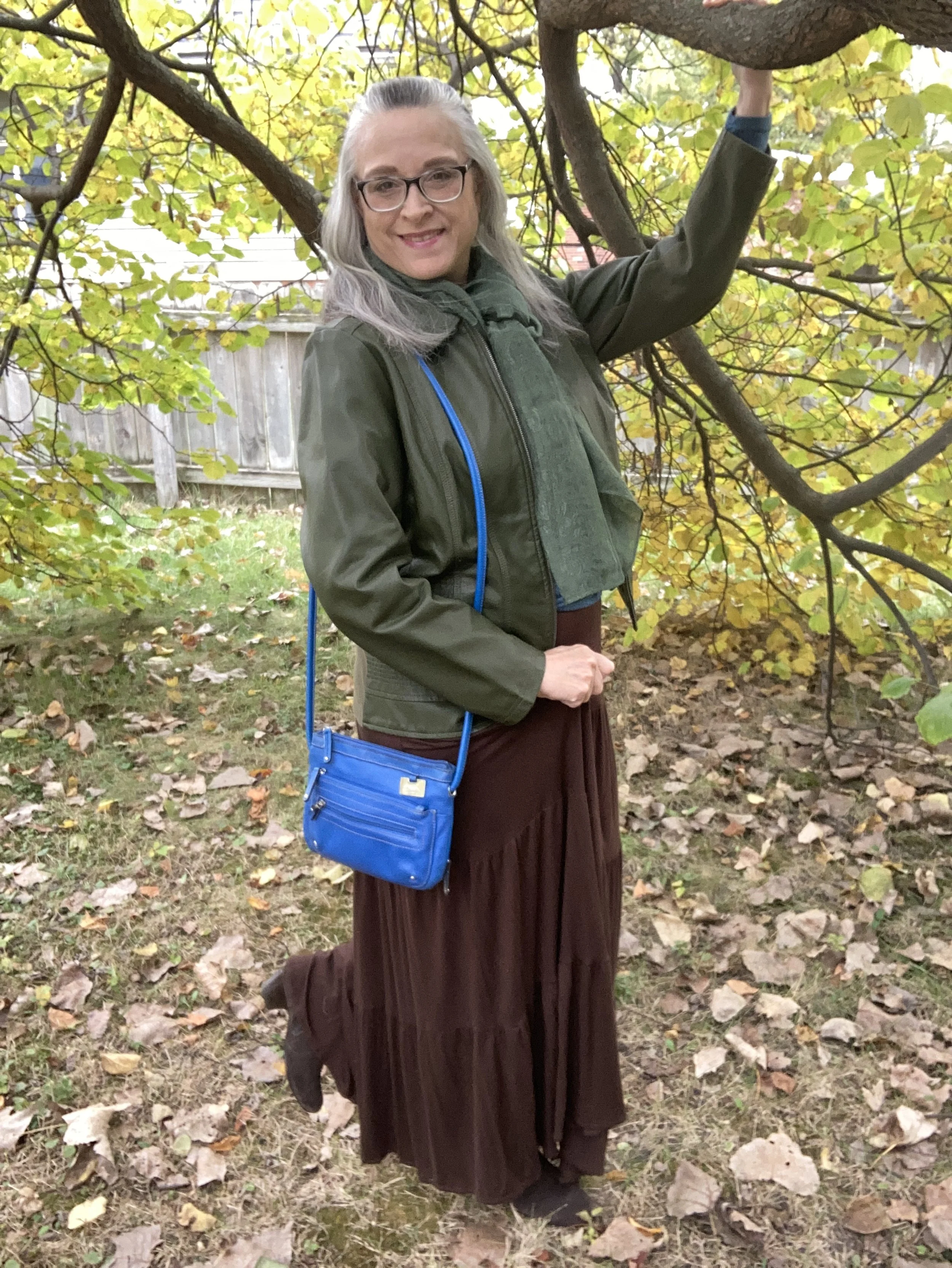 For today’s outfit I looked again at my list of what was trending for Fall 2025. It is hard to even think about fall, as for many of us the leaves are already off the trees, we have had a ground covering snowfall, and we are barreling towards Christmas. However, it is still fall and I won’t pull out my Christmas tees and sweaters until the day after Thanksgiving. Ha, ha.