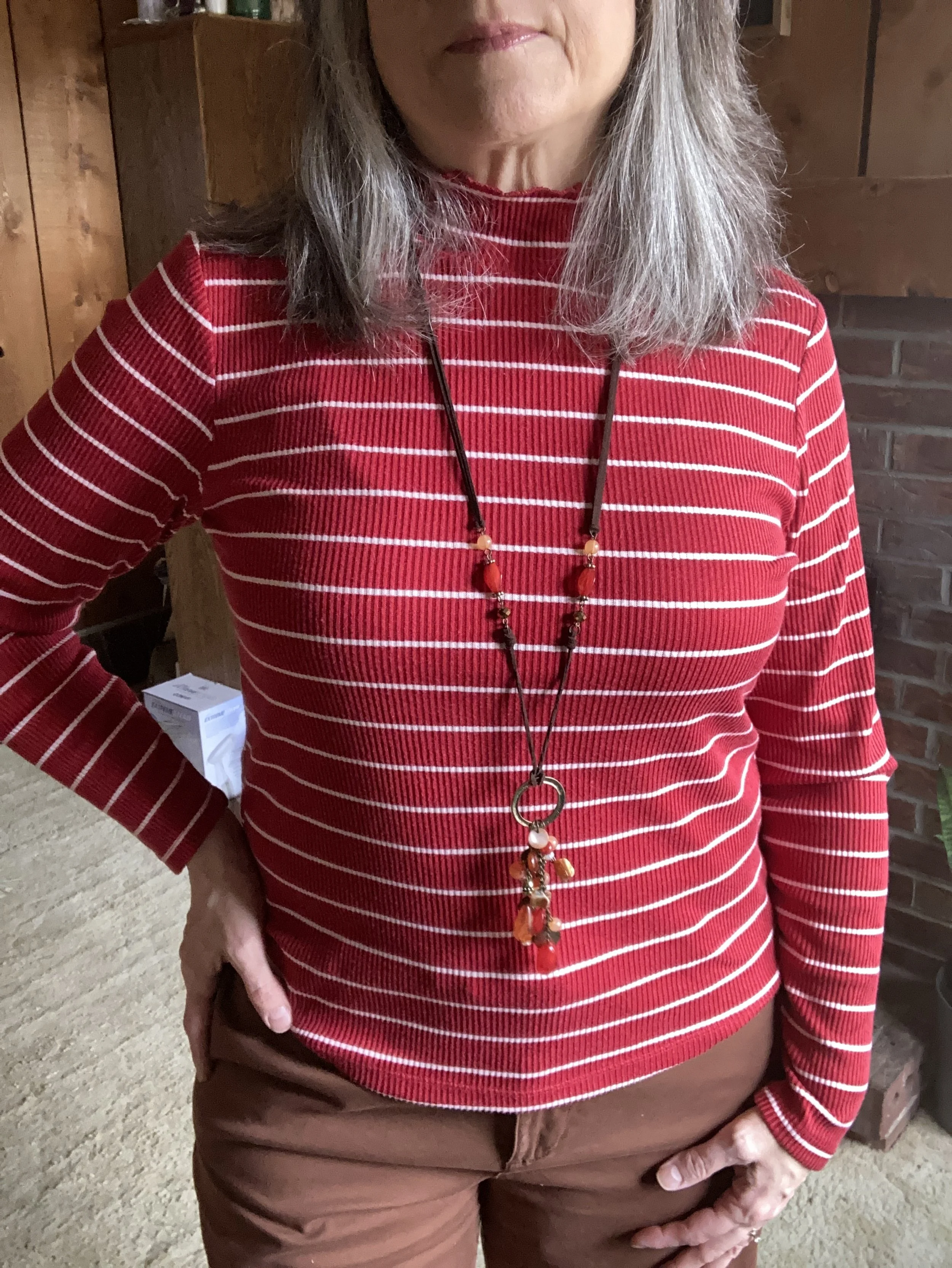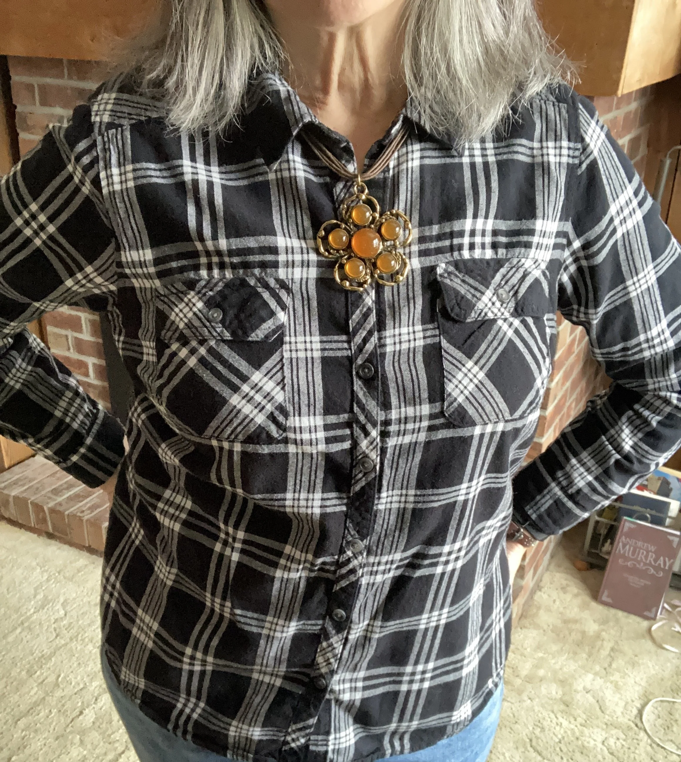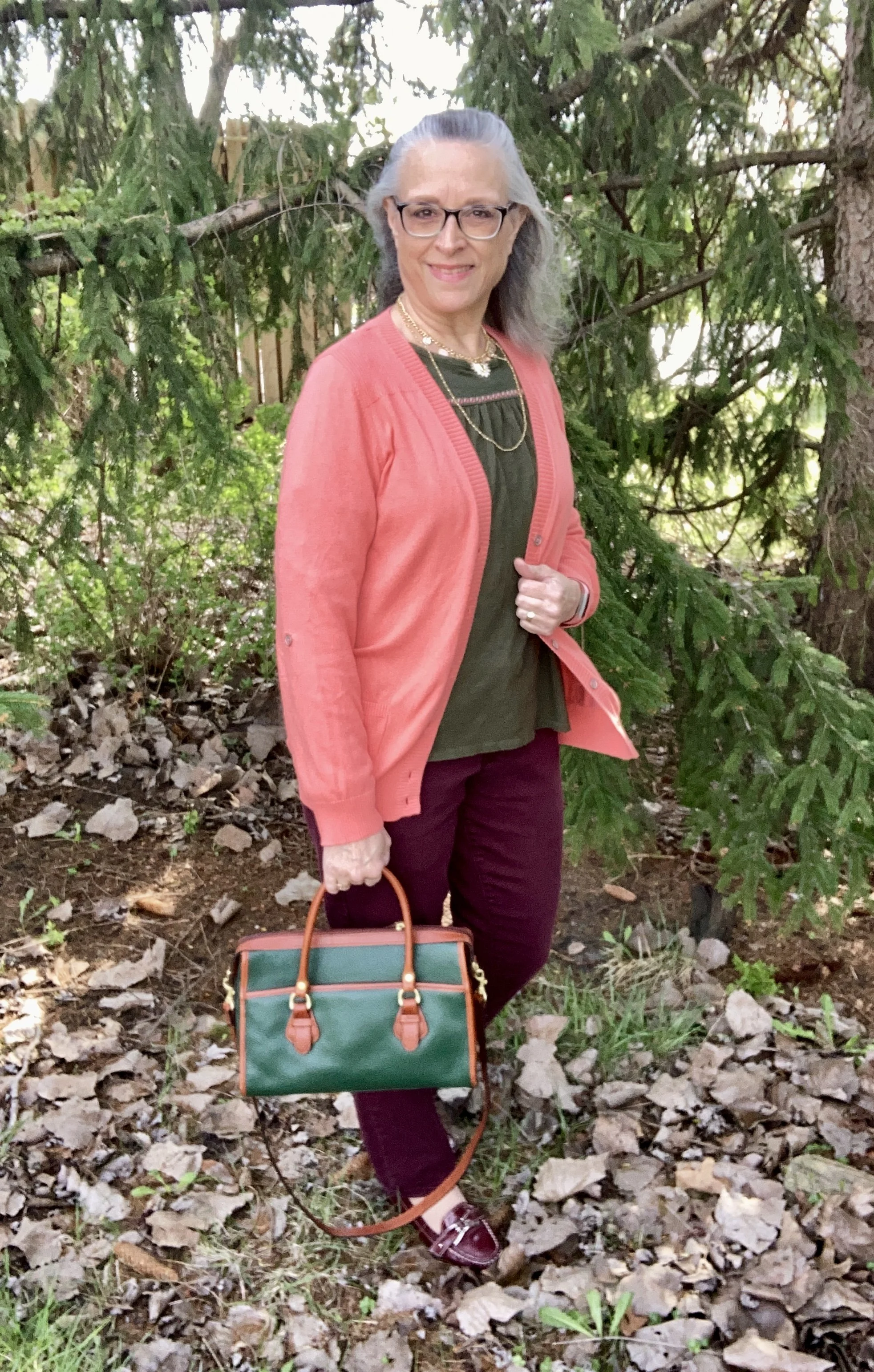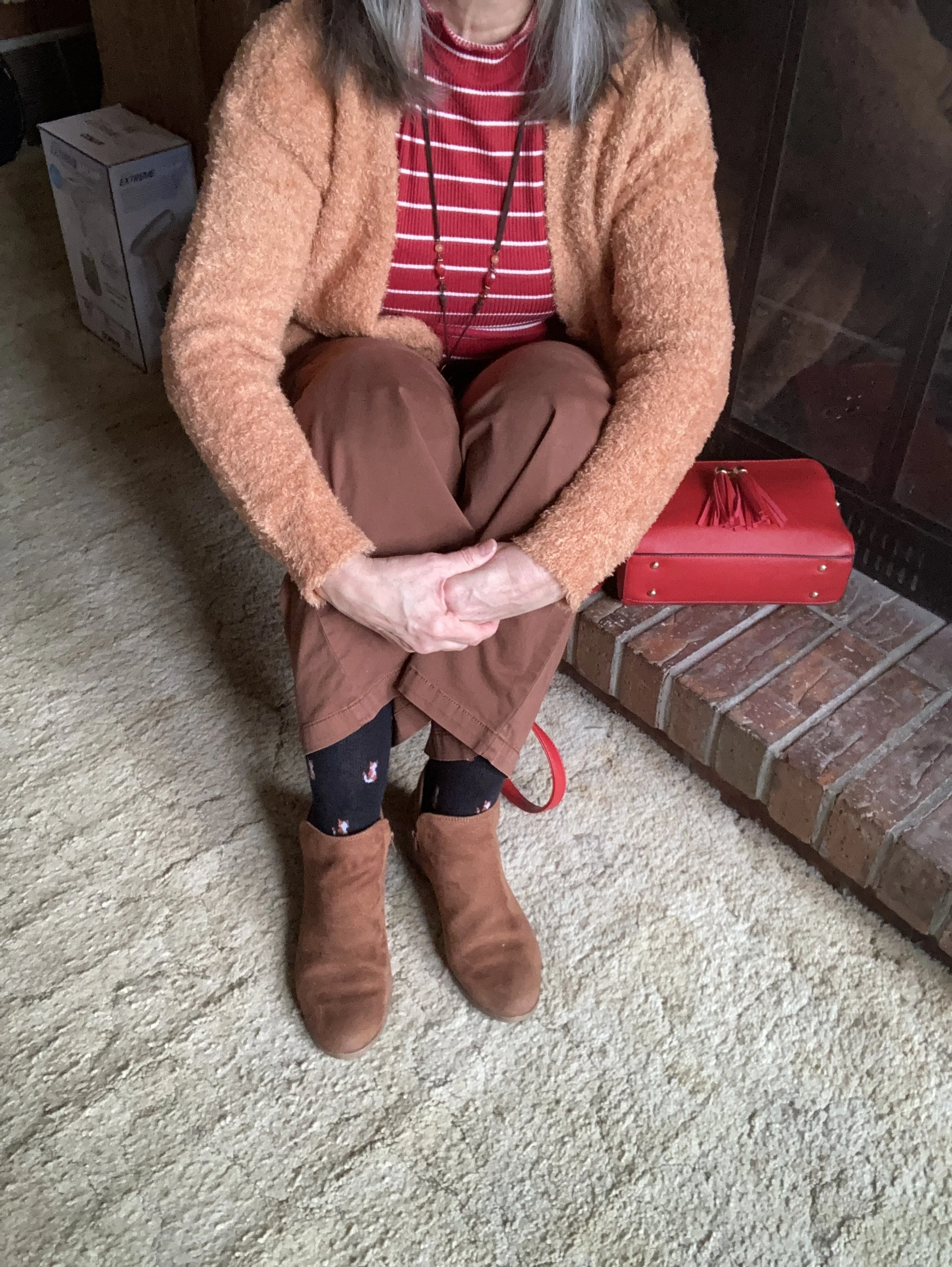 For today’s outfit I looked again at my list of what was trending for Fall 2025. It is hard to even think about fall, as for many of us the leaves are already off the trees, we have had a ground covering snowfall, and we are barreling towards Christmas. However, it is still fall and I won’t pull out my Christmas tees and sweaters until the day after Thanksgiving. Ha, ha.