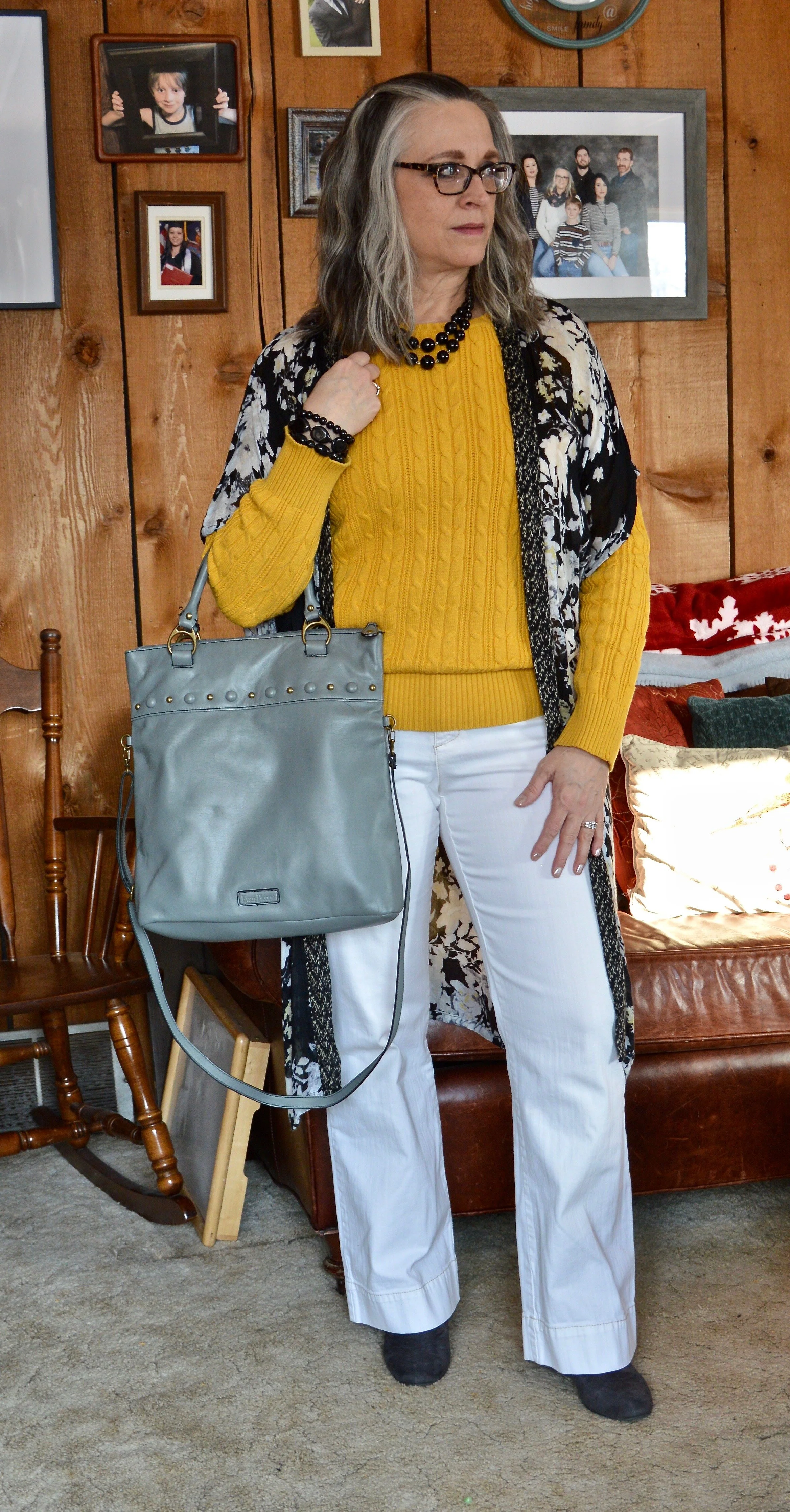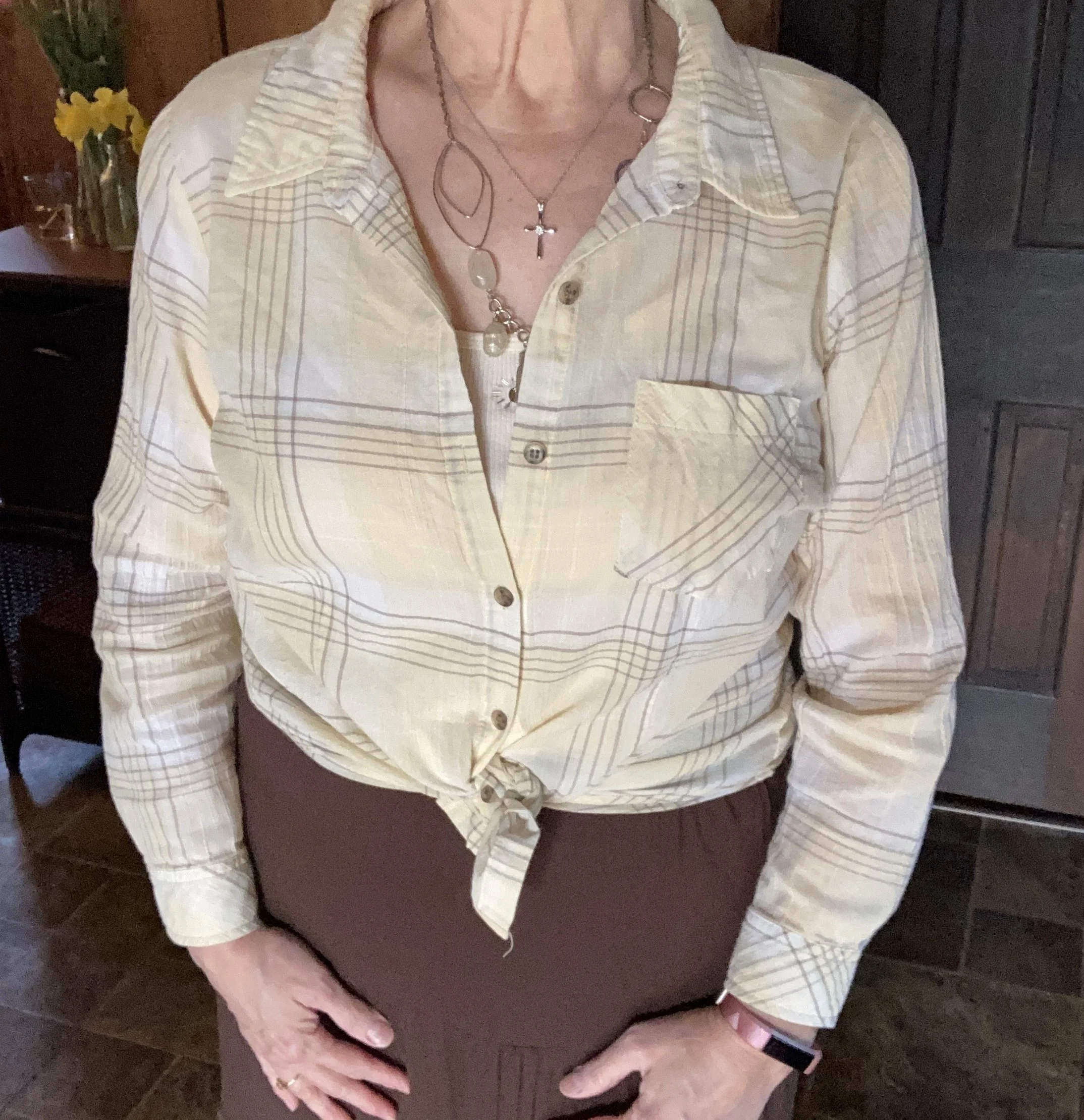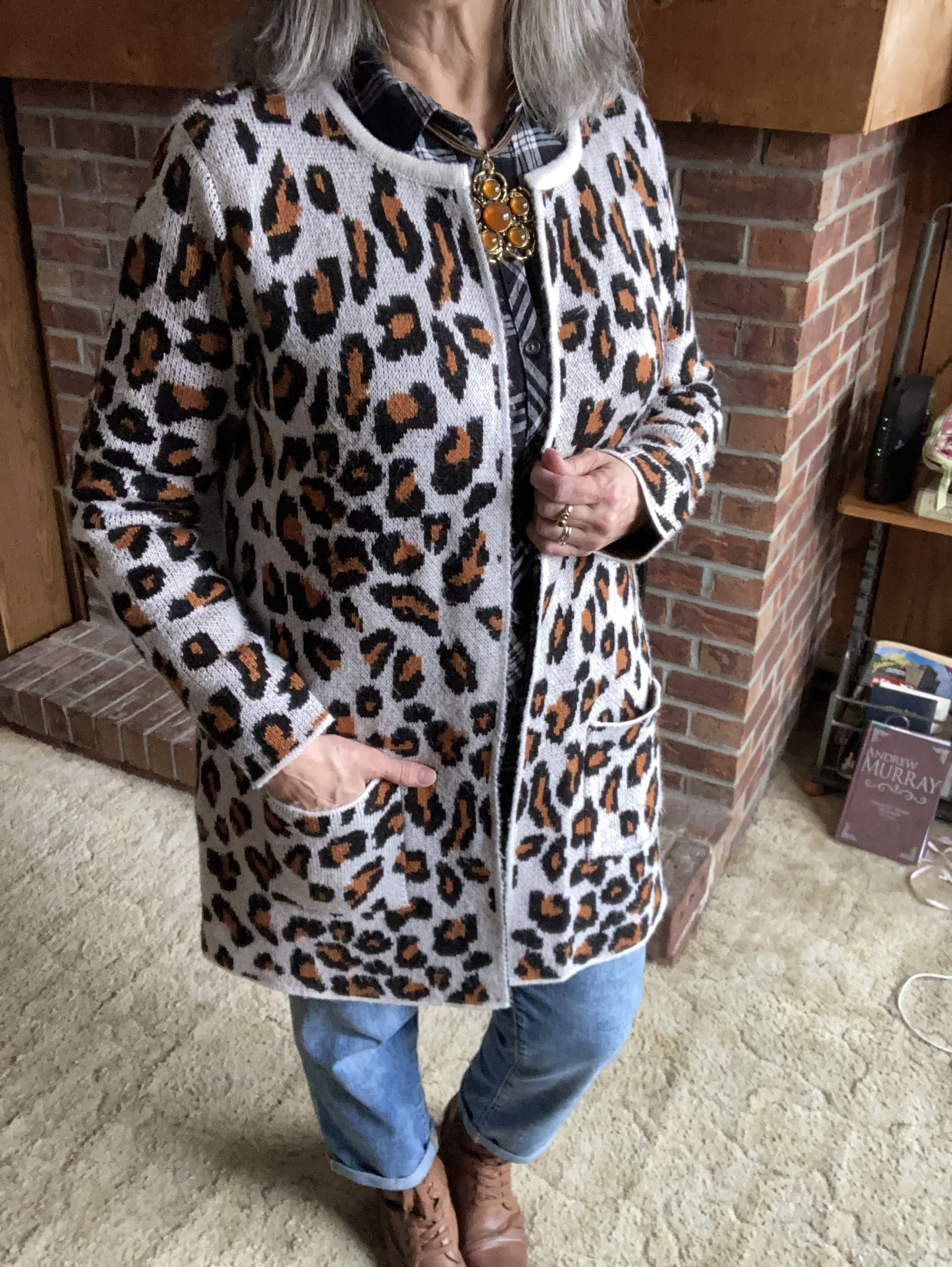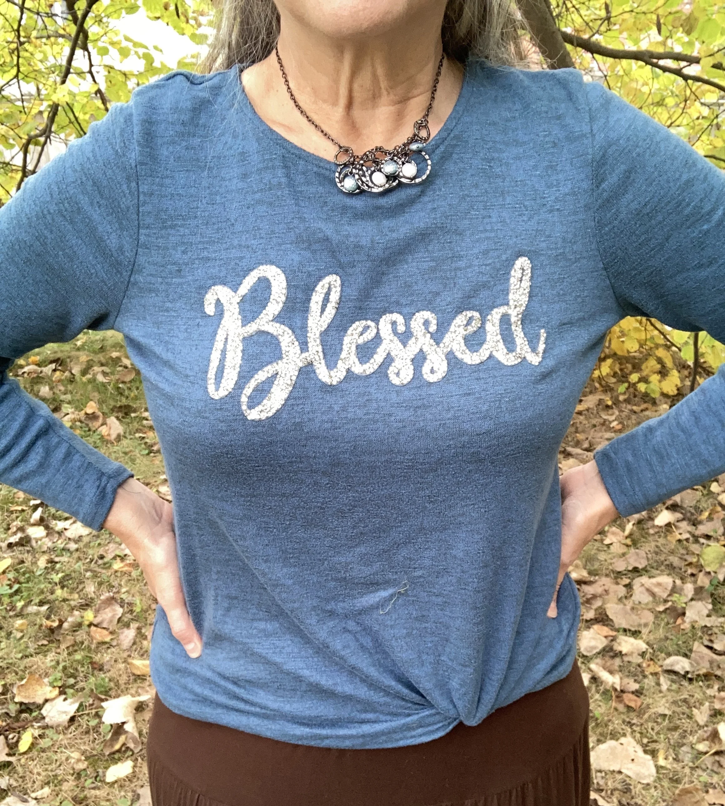 For today’s outfit I looked again at my list of what was trending for Fall 2025. It is hard to even think about fall, as for many of us the leaves are already off the trees, we have had a ground covering snowfall, and we are barreling towards Christmas. However, it is still fall and I won’t pull out my Christmas tees and sweaters until the day after Thanksgiving. Ha, ha.