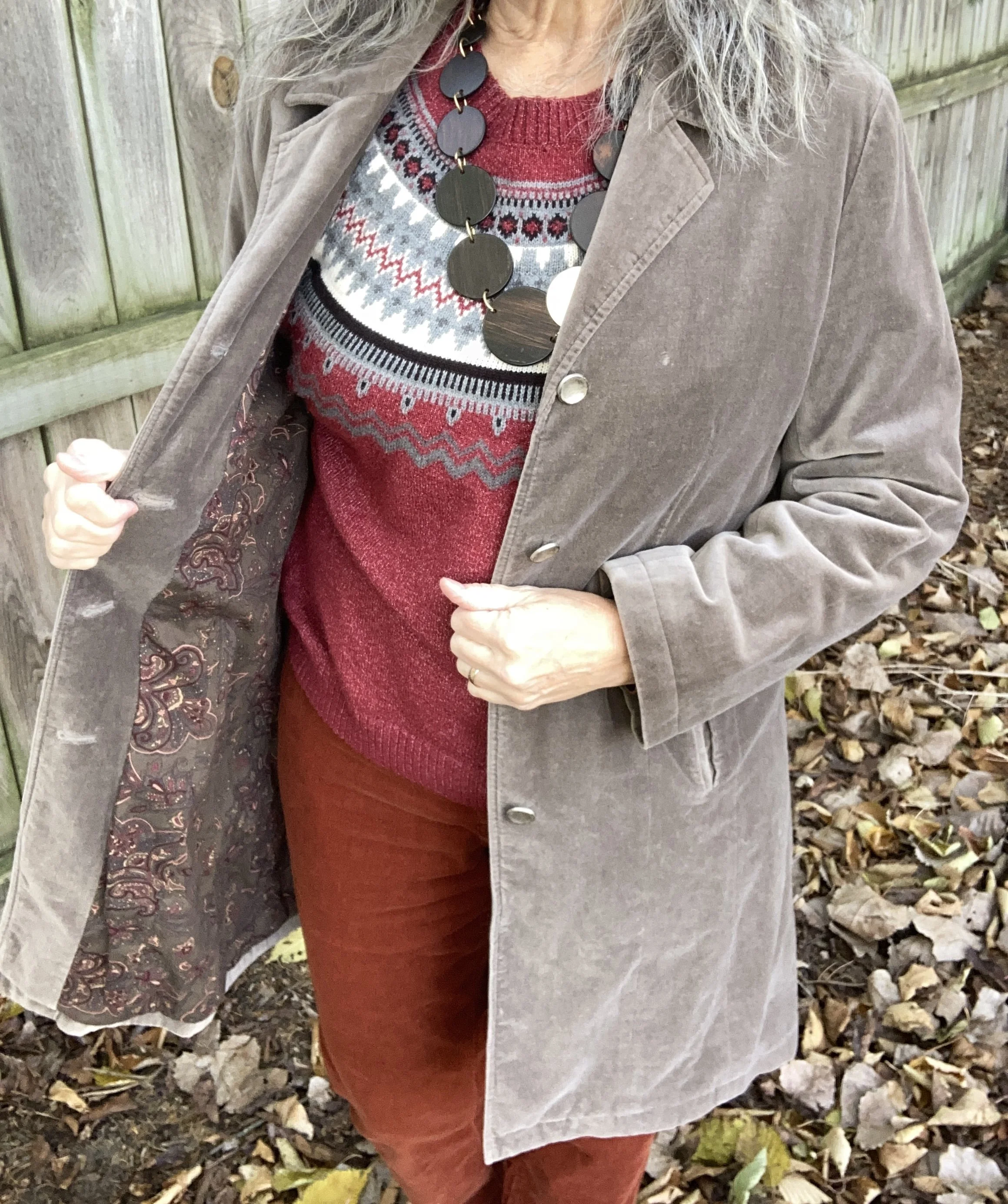 My gray jacket is a beautiful J.Jill piece that I found thrifting a few years back. I don’t wear it a lot, but once in a while it is just the right piece for the occasion. It has a beautiful printed lining. It could also be worn as a fully lined, longer style blazer. It has a velvety feel and can be dressed up or down. I linked a few velvet style blazers below.