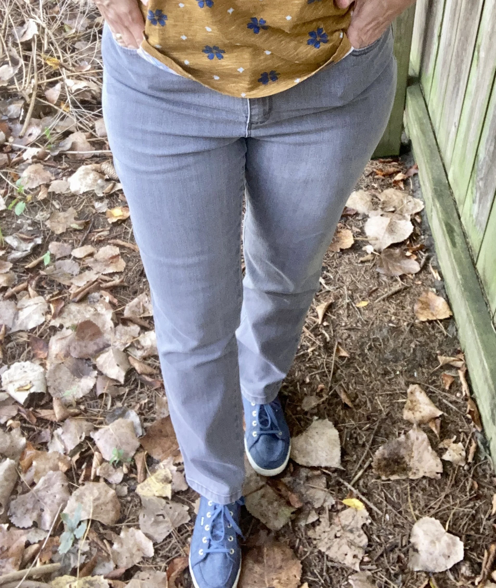 I thought these second hand, Gloria Vanderbilt utility pants were a close match to Wispy Clouds. They are a lighter weight so will be put away for the winter, but they are a great pair of pants for a dressy casual vibe. The utility details of extra pockets and rivets make it more casual, but the wider legs give them a dressier trouser vibe.