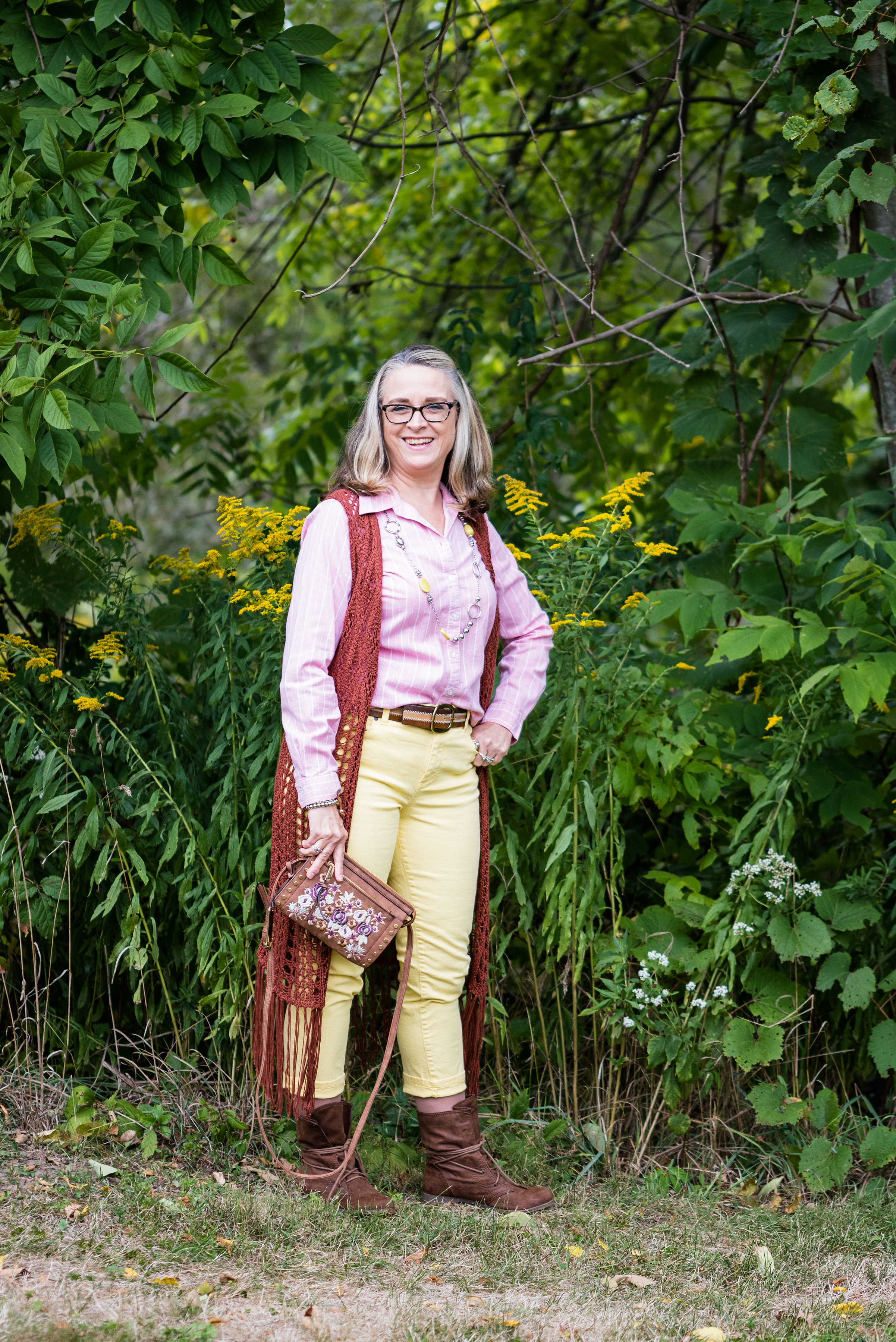 All of the pieces in this outfit were thrifted except the bag and the boots. The Limelight colored jeans are Talbots brand and are really an ankle pant that I rolled up, so they stop at the top of my boots. The Mellow Rose button up is Izod brand and the long fringe knit vest is a brand called Sun and Shadow. I’ve styled this vest several times before. You can see those posts here and here.