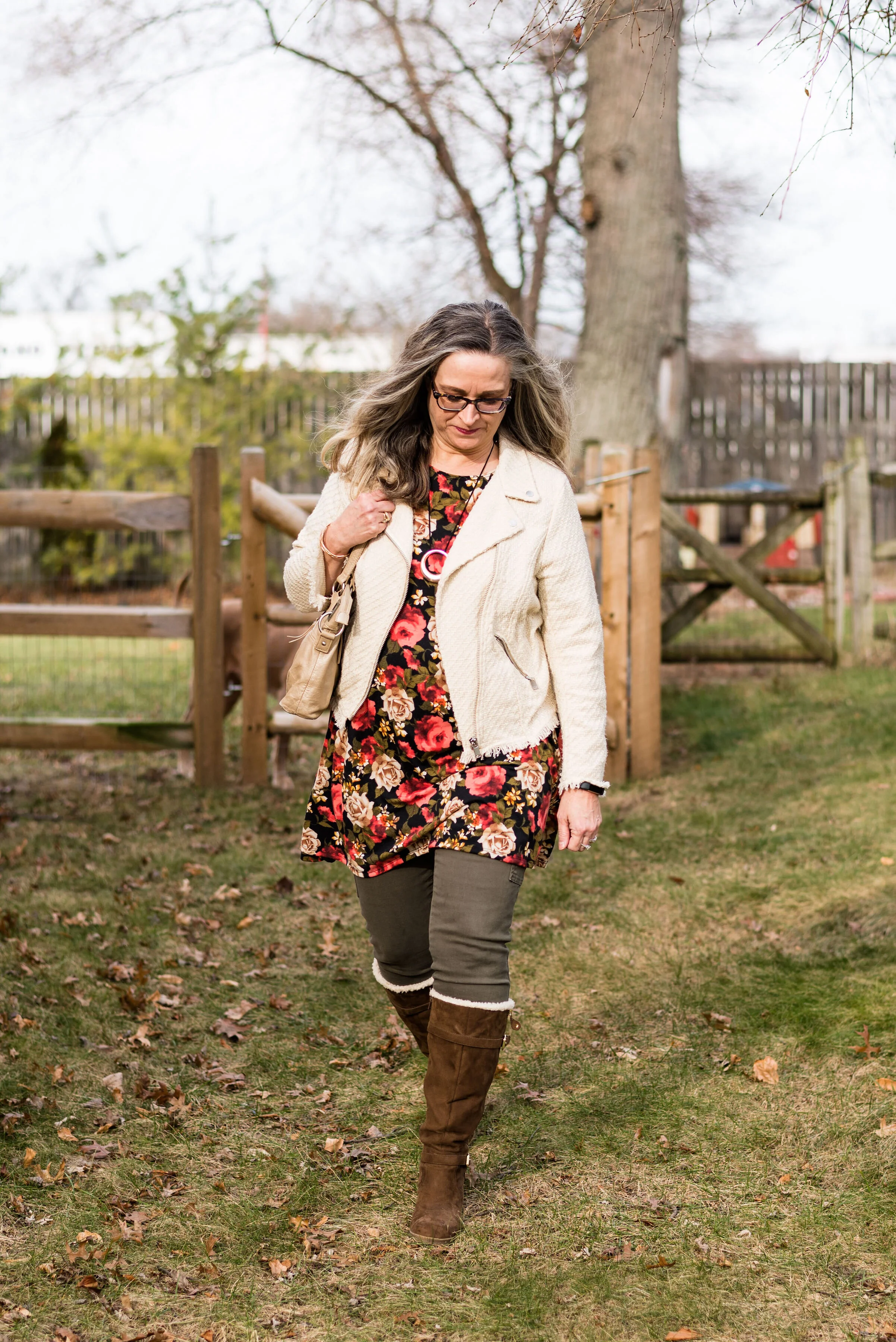 This is the second installment in my Layering Light series. This is not about layering light weight layers, but about layering up with light colors; colors that will help lift your mood in the deep, dark, doldrums of winter. Last week I showed you an outfit with light wash jeans, light neutral layers and a scarf that brought a bright pop of sunshine yellow. This week I reached for a floral dress and a light colored jacket to lighten up the blue mood.