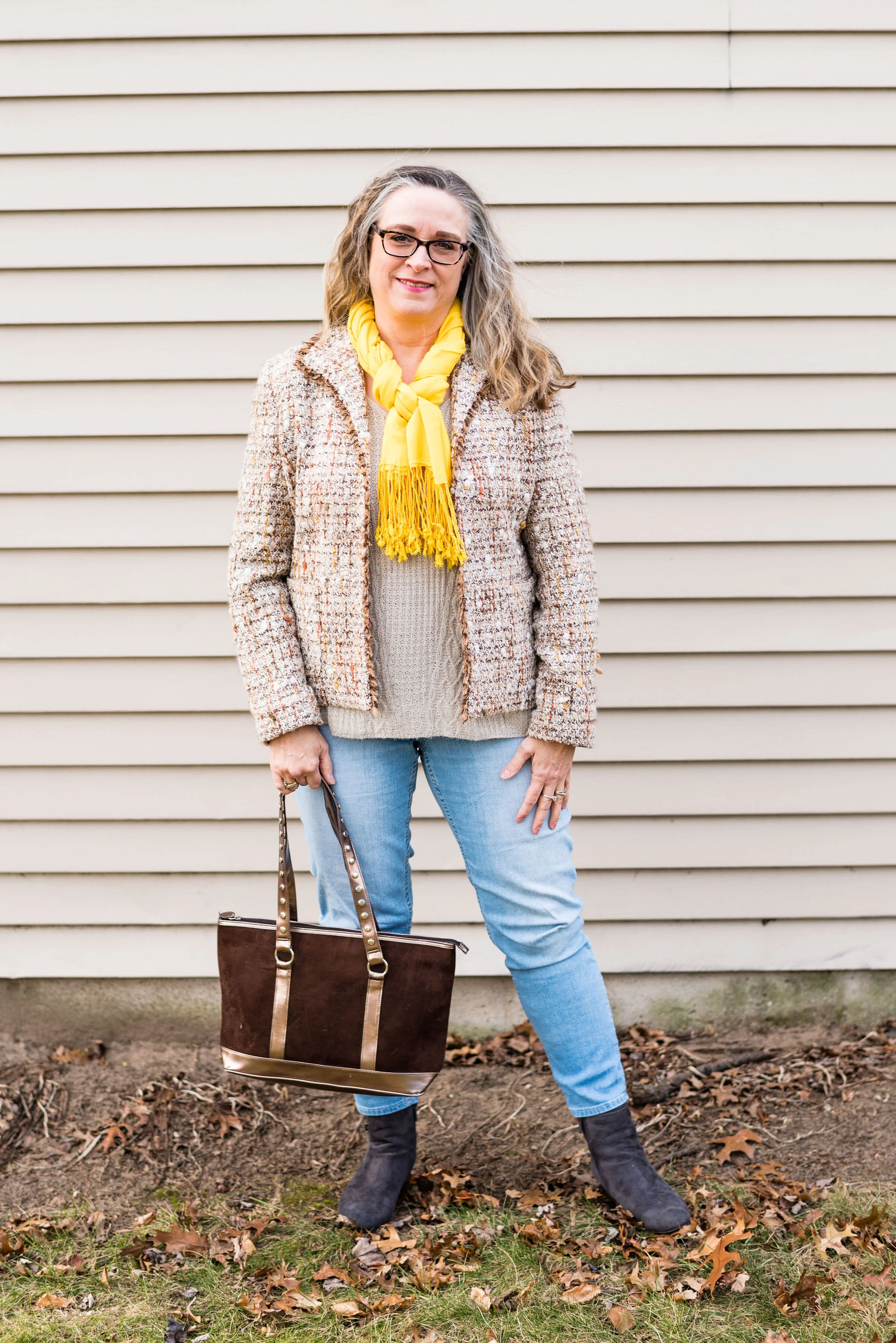 I know not everyone likes tweed. For many years it was associated with old women. I am an older woman, but I think we just need to get over the whole, “Older women shouldn’t wear that,” or “Younger women shouldn’t wear that.” What really matters is finding your own style. I happen to like tweed and I have seen numerous “youngsters” wearing it on Pinterest. Check out this, this and this. I think tweed would look pretty with a flowy maxi skirt, a pencil skirt or even over a dress. Never say never when it comes to trying something different.