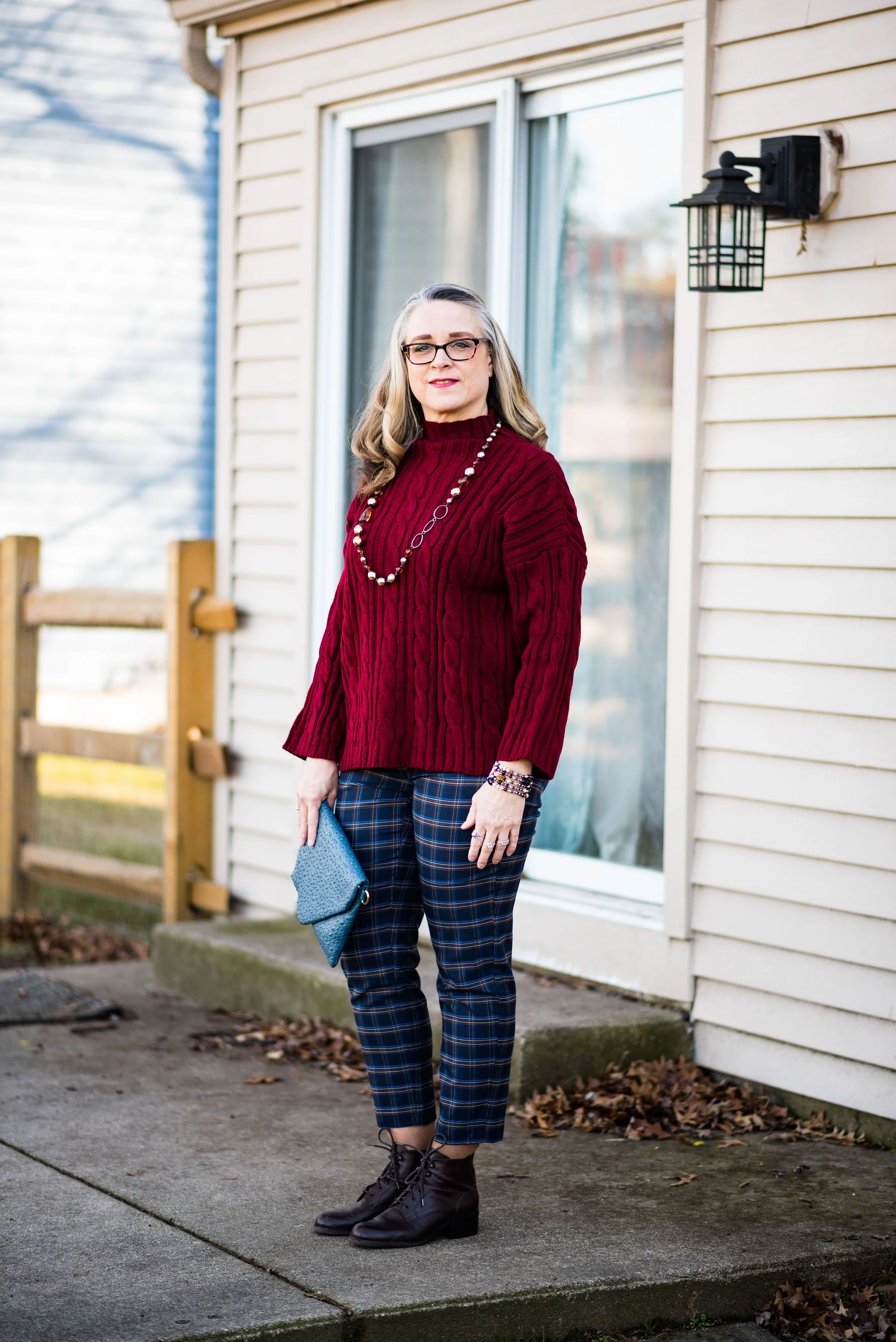 I decided to style the sweater for this shoot with my plaid ankle pants, however, I wore this to work the other day and wore a pair of boot cut jeans and my dark red, ankle boots. The plaid pants are fun, but with where this sweater ends, adds a great deal of bulk to my widening bottom. Yes, I am one of those people who gained weight over Christmas!