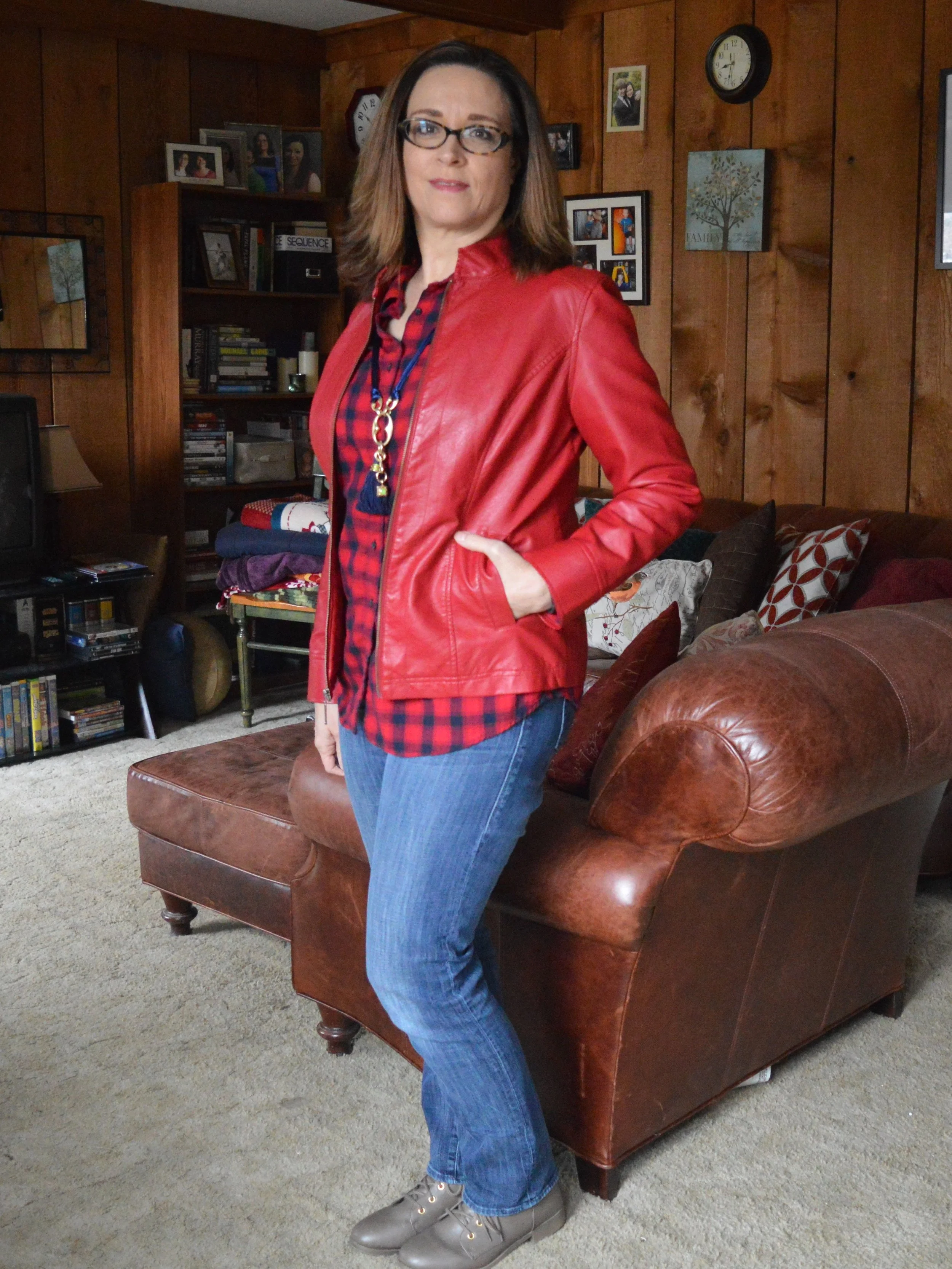 I'm hanging out at home this morning, but I am also meeting a friend for lunch, so I opted for warm and casual. I started with my red and navy plaid shirt and my Rock and Republic jeans.