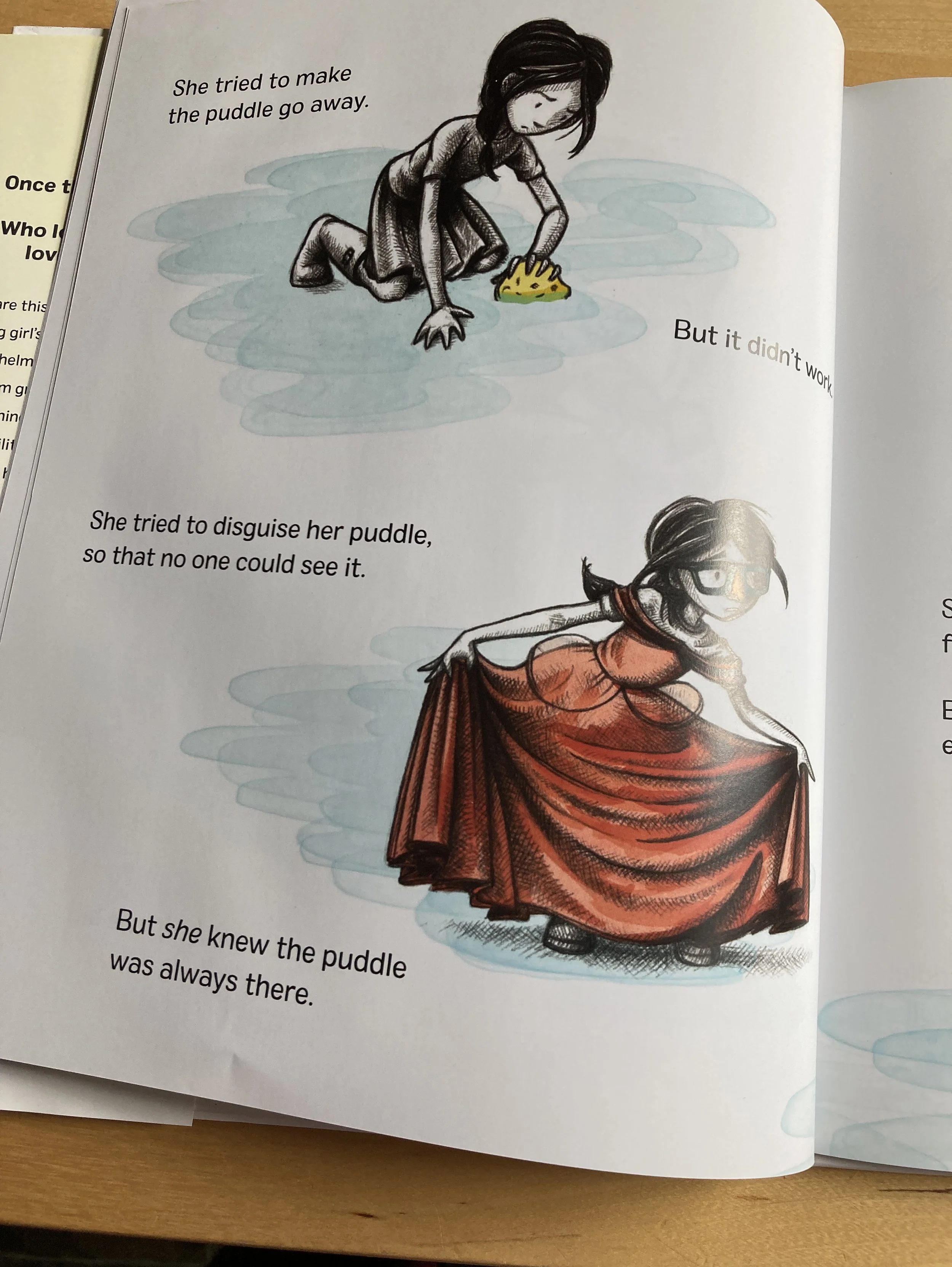 Through well positioned words, easily understood sentences and beautiful illustrations Jana and Abby convey the difficult reality of grief, but as the story unfolds we are led through three encounters the girl has with a puppy, a farmer and another child who benefit from her “good for nothing puddle.”